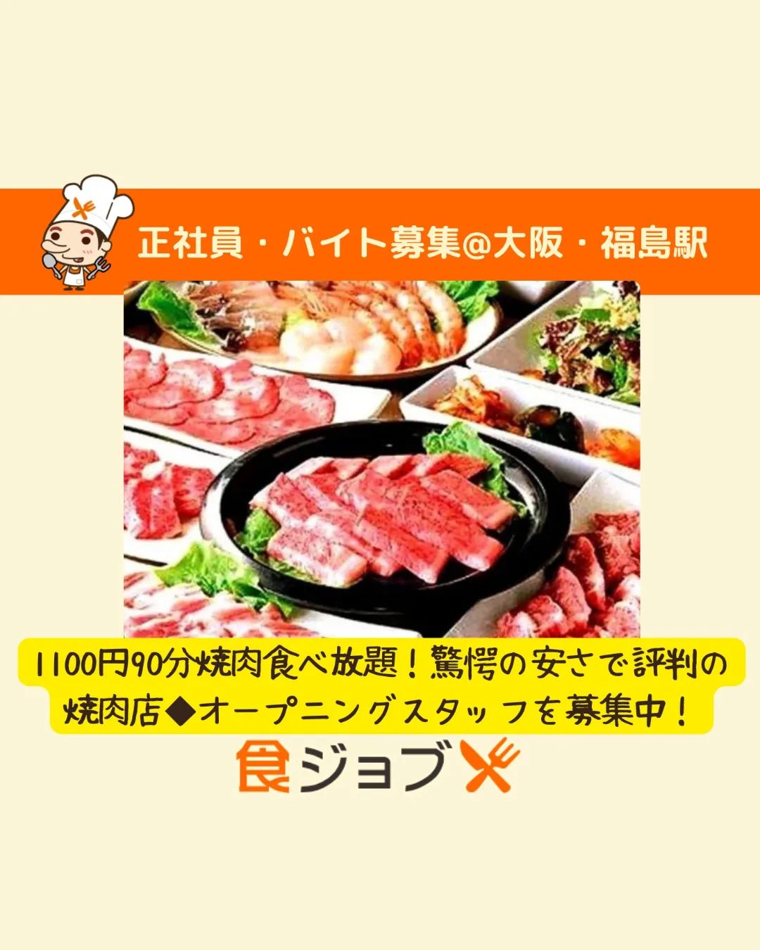 【大阪・福島】関西で人気を集める、焼肉ブランドがグルメ激戦区である福島エリアに進出!驚愕の安さが評判♪1100円で90分焼肉が食べ放題。オープンしたばかりのお店で、スタッフ募集中です!ワークライフバラ...続きを読む