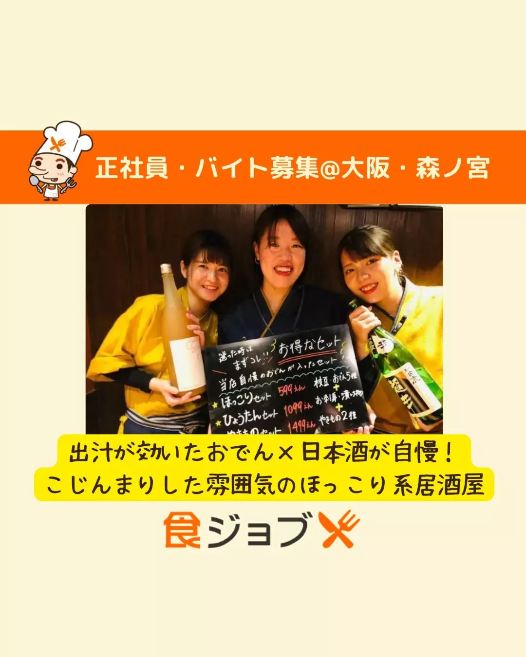 JR森ノ宮駅から1分!大阪城のライトアップが綺麗なほっこり系・居酒屋♪ (正)26万〜30万円(ア)時給1,050 円~1,200円!出汁が効いたおでん×日本酒が自慢◎美味しいまかない付き お店の理念...続きを読む